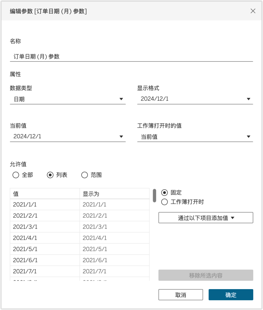 首先,建个“目标月份”的参数,选日期类型、年月格式。