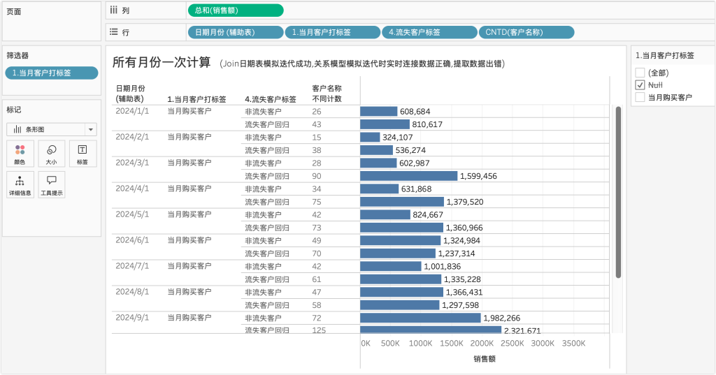 这里需要 按照FIXED“客户+统计月”分组,标记当月购买的人。