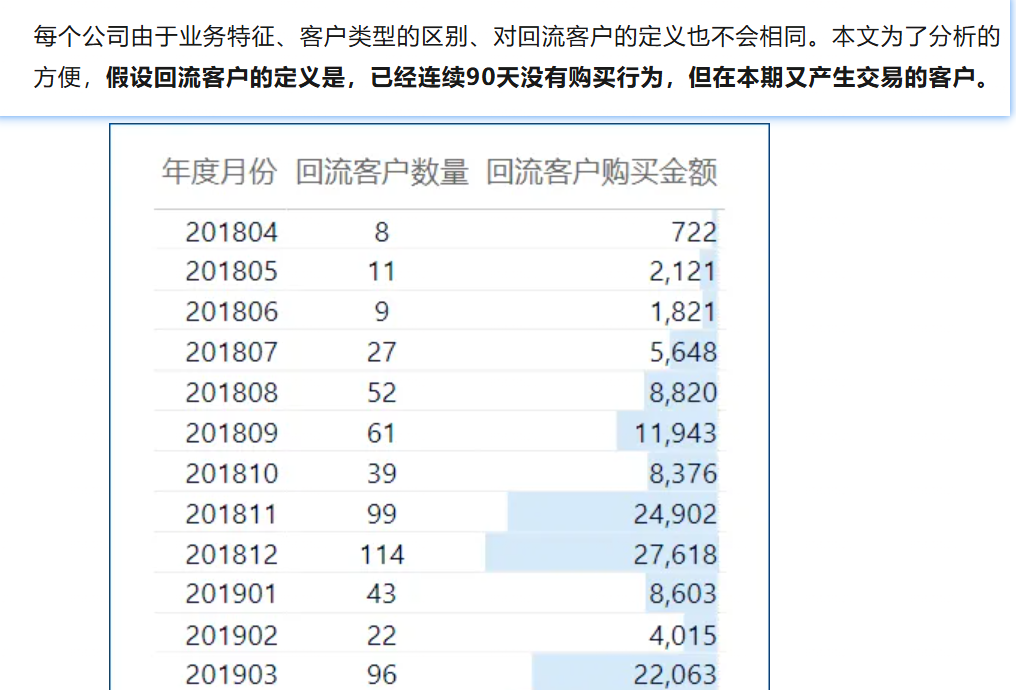 啥是客户回流简单说——之前买过,然后“消失”了(这里按“连续90天没下单”算),结果当月又跑来买了,这类客户就是“回流客户”。