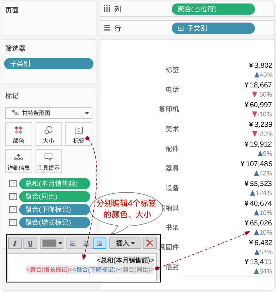 1. 常规Unicode特殊符号:无自带颜色,默认多为黑色/灰色,无法直接修改单个符号的颜色和大小,需在使用环节调整;若需按条件实现符号颜色差异化(如向下三角标红、向上三角标蓝),需为不同条件分别创建计算字段,每个字段对应单一符号,再将所有字段拖入文本标签,为各字段单独设置颜色、大小。