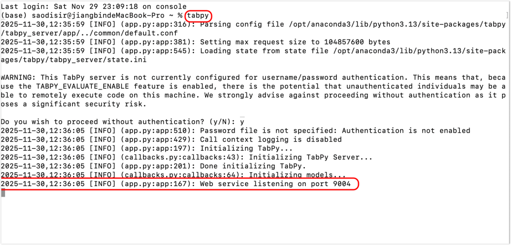 5. 终端再次启动 TabPy 时指定配置文件:tabpy –config ~/.tabpy/tabpy.conf