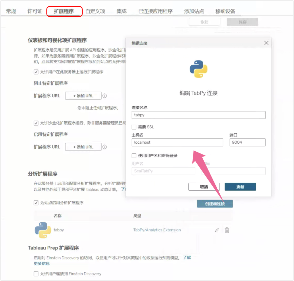 若需在 Tableau Server 中使用 Prep 脚本,需额外配置服务器端 TabPy 连接: