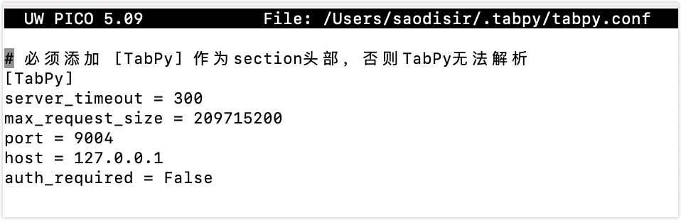 2. 新建并编辑配置文件:nano ~/.tabpy/tabpy.conf